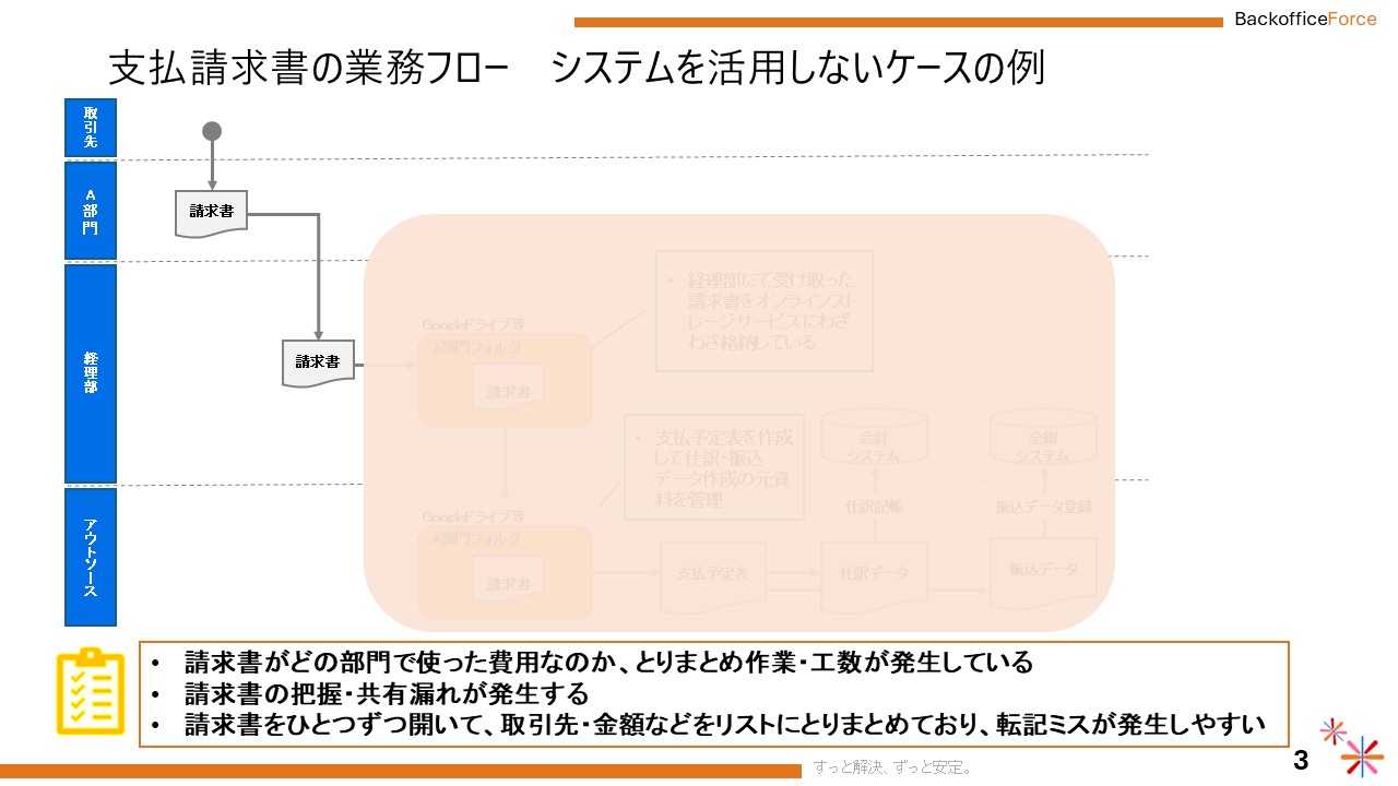 経理人材の人材不足や採用難が進む今、業務分担と効率化が重要になっています。本資料では、システムの活用例をご紹介するとともに、業務フロー整備やシステム導入によるメリットを分かりやすくまとめています。